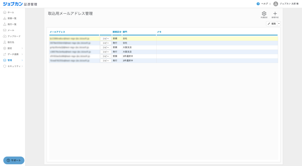 メールアドレスを部門設定と連動することが可能になり、指定のメールアドレスに送付された、受領帳票・発行帳票へ部門が自動で設定されます。