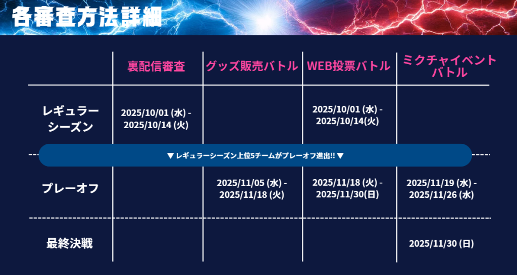 スケジュール | ◆レギュラーシーズン(予選) 2025年10月1日(水)〜2025年10月14日(火) ◆レギュラーシーズン結果発表 2025年10月15日(水) ◆プレーオフ(準決勝) ・グッズ販売バトル 2025年11月5日(水)〜2025年11月18日(火) ・ミクチャイベントバトル 2025年11月19日(水)〜2025年11月26日(水) ・WEB投票バトル 2025年11月18日(火)〜2025年11月30日(日) ◆プレーオフ結果発表 2025年11月28日(金) ◆最終決戦 2025年11月30日(日) |