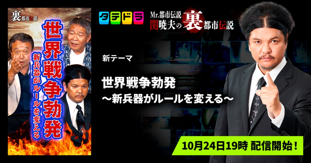 【新テーマ追加】「タテドラ」オリジナルバラエティ企画『Mr.都市伝説 関暁夫の裏都市伝説』、新作「世界戦争勃発〜新兵器がルールを変える~」全17話を10月24日(金)より配信開始 アプリ内総視聴回数はついに300万回突破!軍事ジャーナリスト2名を招き、日本の国防や安全保障の現状を語る
