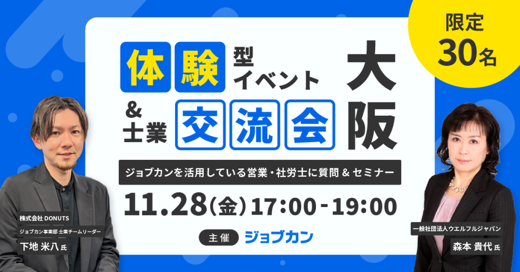 株式会社DONUTS(東京都渋谷区、代表取締役:西村啓成)が提供するバックオフィス支援クラウドERPシステム「ジョブカン」は、士業事務所の方を対象とした「体験型イベント&士業交流会」を2025年11月28日(金)に大阪で開催いたします。