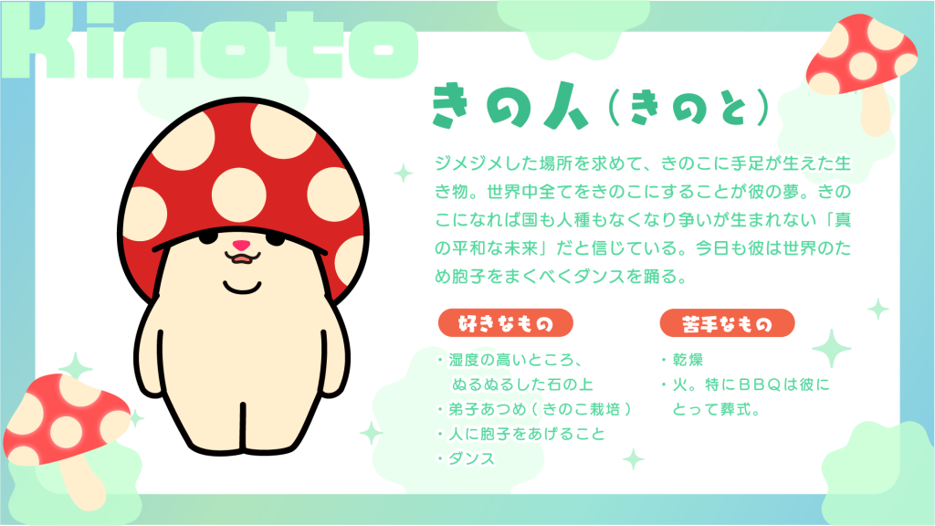 ジメジメした場所を求めて、きのこに手足が生えた生き物。世界中全てをきのこにすることが彼の夢。きのこになれば国も人種もなくなり争いが生まれない「真の平和な世界」だと信じている。今日も彼は世界のため胞子をまくべくダンスを踊る。