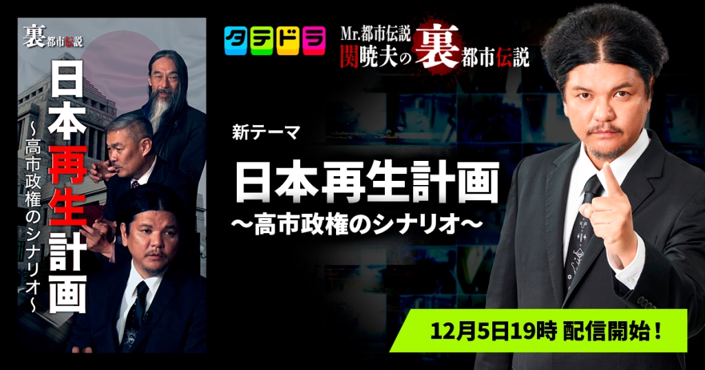 『Mr.都市伝説 関暁夫の裏都市伝説』、新作「日本再生計画〜高市政権のシナリオ〜」全16話を12月5日(金)より「タテドラ」で配信開始 日本史上初の女性首相、高市早苗新内閣の誕生で日本はどう変わるのか、歴代首相から託される想いや総裁選の裏側にも迫る