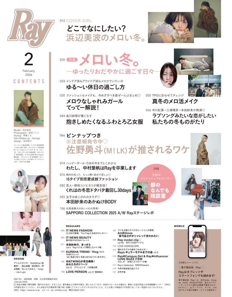 『Ray』2026年2月号は12月23日(火)発売!通常版は浜辺美波さんが2度目の表紙、特別版は佐野勇斗さん(M!LK)が『Ray』初表紙を飾る! 高橋璃央さん、都さん、豊田裕大さんらが登場する今号の大特集テーマは「メロい冬。」!さらに中村里帆が専属モデルを卒業!