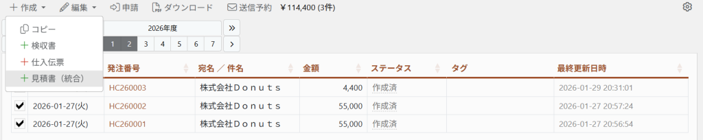複数の帳票を一つにまとめて見積書を作成できます。また、仕入先(得意先)が異なる発注書も選択可能なため、複数仕入先からの見積書作成を効率化できます。